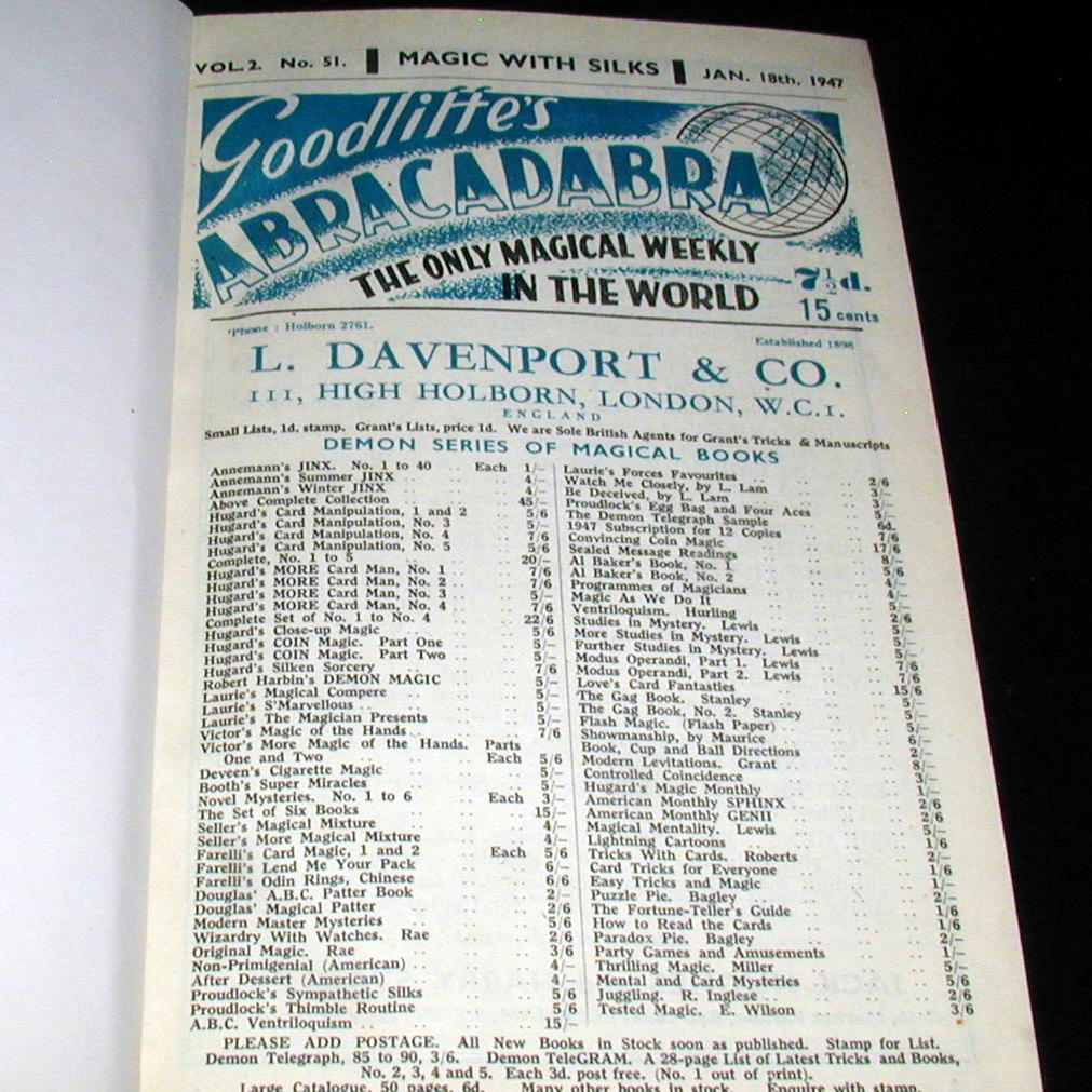 (c. 1947) (Submit Review) (Submit Update)Details: The weekly magazine Abracadabra was created by Charles Goodliffe Neale (1912 – December 26, 1980). He was a magician and author. From the very first issue, Goodliffe (as he preferred to be called) gave the magazine the cover tag line of “The Only Magical Weekly in the World”. Goodliffe was a man of strong views and the magazine became the arena of many controversial debates about magic and magicians, sometimes initiated by the readers themselves through their contributions and letters.