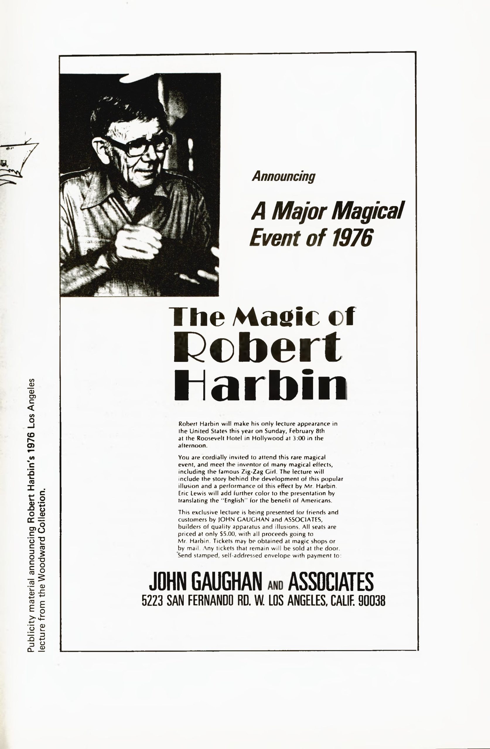 (c. 1983) (Submit Review) (Submit Update)Details: The words are by Robert Harbin and the design and graphics and page layout are by my great friend Eric Mason who passed away a long time ago. Many people who had Harbin collections were kind enough to allow us to use a number of Harbin photographs and items of ephemera and Eric did a wonderful job of putting the book together. Zee and Chris Woodward were most helpful and lent us a lot of material such as original photographs and programmes and many other items relevant to Robert Harbin.
