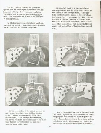 - Ultimate Aces: Four Blue-Backed Aces are placed in a row on the table. Three Red-Backed indifferent cards are placed on each. One at a time, the Aces vanish from their packets and arrive in the fourth. Each ace vanishes Singly, and the aces arrive in the last packet One at a Time.