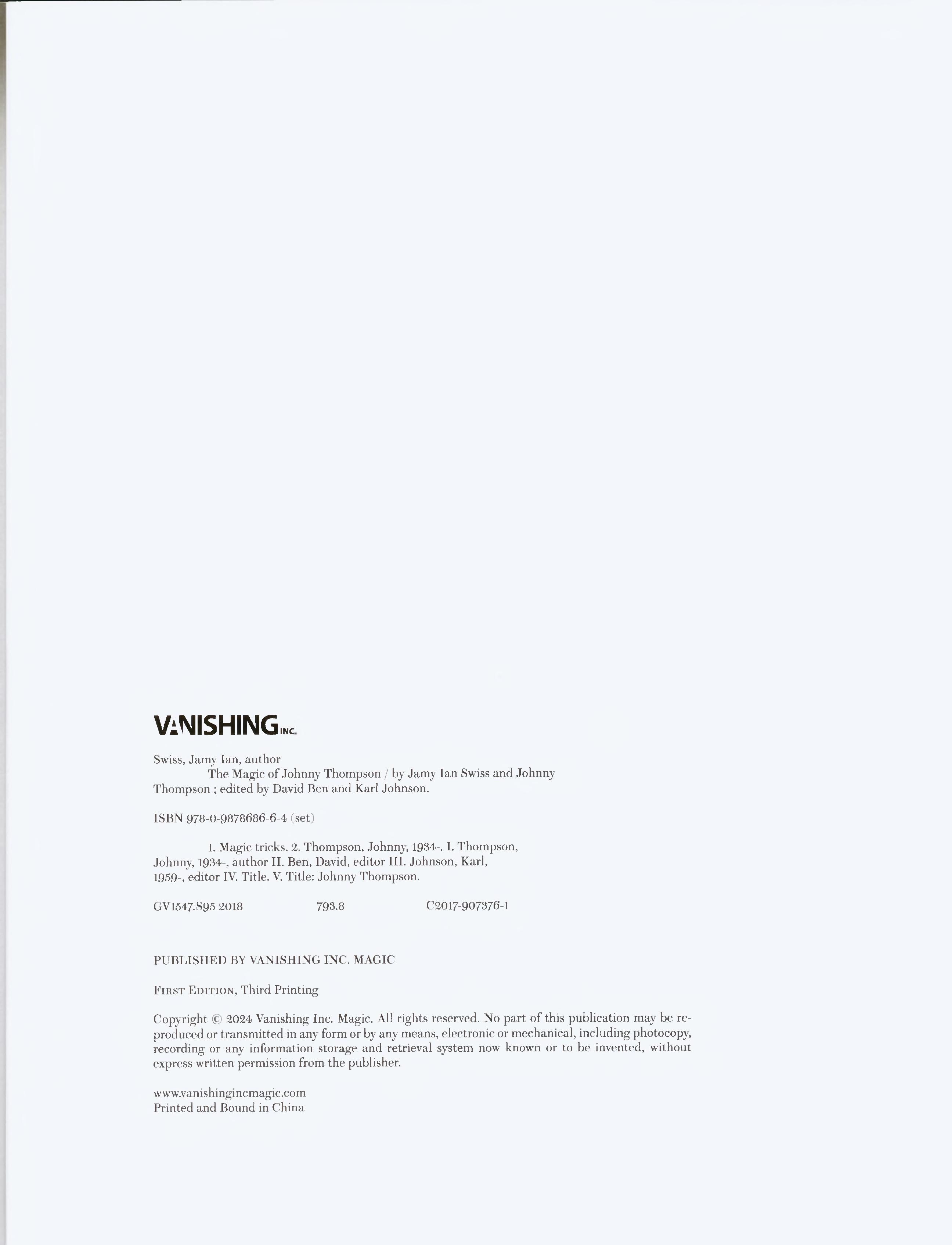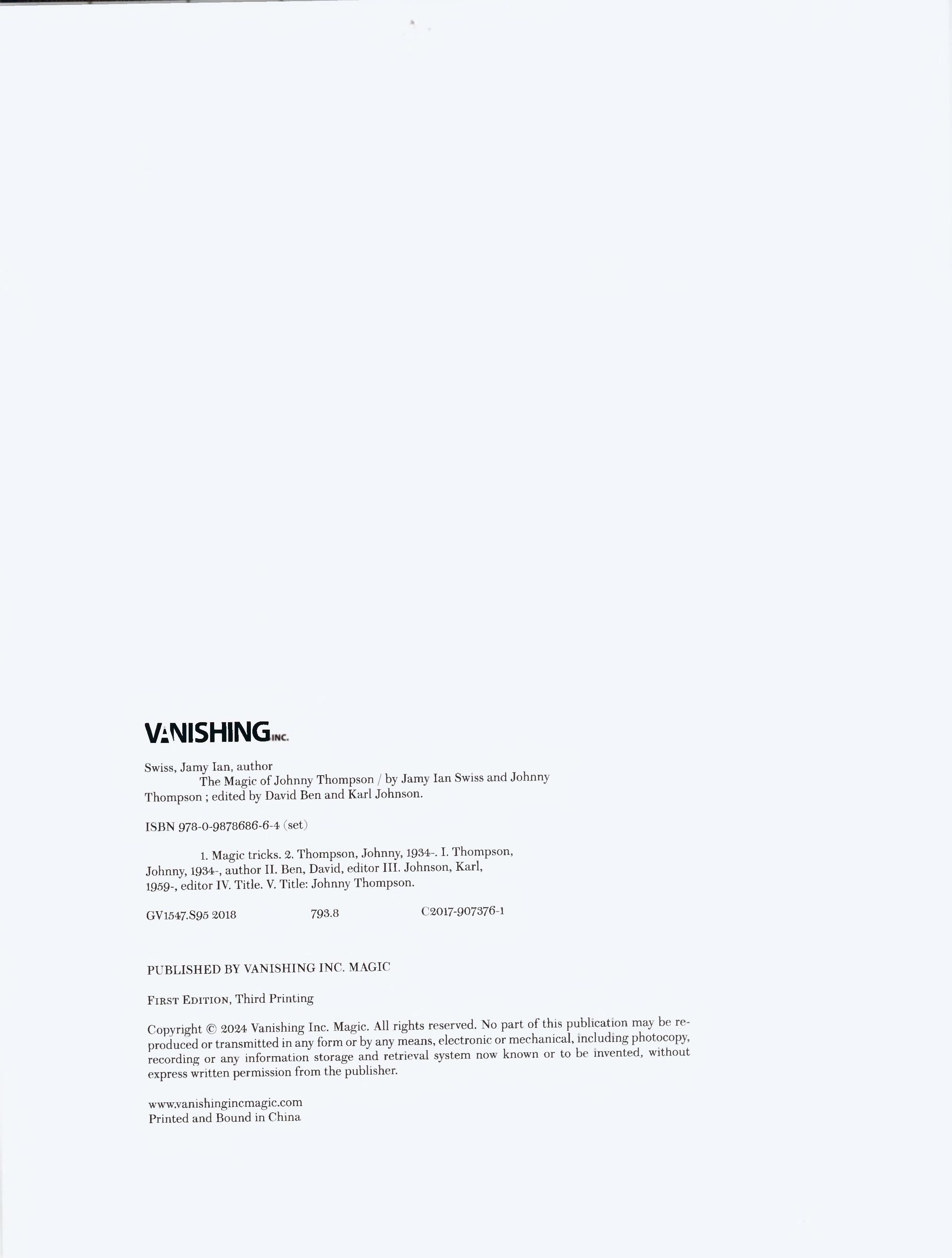 Upon Johnny’s passing in 2019, there were fears among the community that the book may never be printed again. However, as part of our acquisition of Magicana’s publishing business, Vanishing Inc. has gained the rights to re-print some of magic’s most seminal titles. Among them was The Magic of Johnny Thompson.