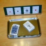“That leaves you with a packet of four cards in your left trouser pocket. Please take it out and deal the four cards face outwards along the stand.”