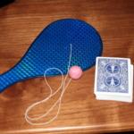 Effect: From a deck of cards one is chosen, remembered and returned to the deck. A paddle and ball is introduced and the magician starts tapping the ball back and forth and amazingly when the bat is turned over the chosen card is attached to the elastic and impaled on the bat!