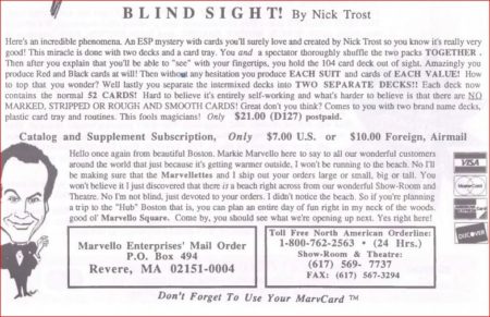 (c. 1992,2005) (Submit Review) (Submit Update)Blind-Sight, which works entirely on the Gilbreath principle, was developed over a period of time. I came up with a new method for “mixing” the cards that I am quite pleased with. The “mix” appears so random that it is hard to conceive how the performer could know the location of any card.
