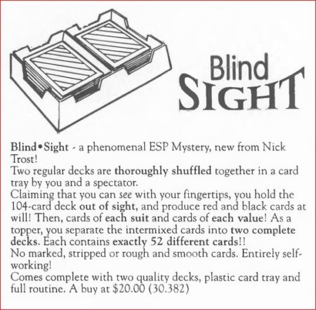 Effect: Two regular decks are thoroughly shuffled together in a card tray by the performer and a spectator. Claiming he can “see” with his fingertips, the performer holds the 104-card deck out of sight and produces red and black cards at will. Then he produces cards of each suit, each value, and finally—and this is the topper—he separates the intermixed cards into two complete decks so that each contains exactly 52 different cards.