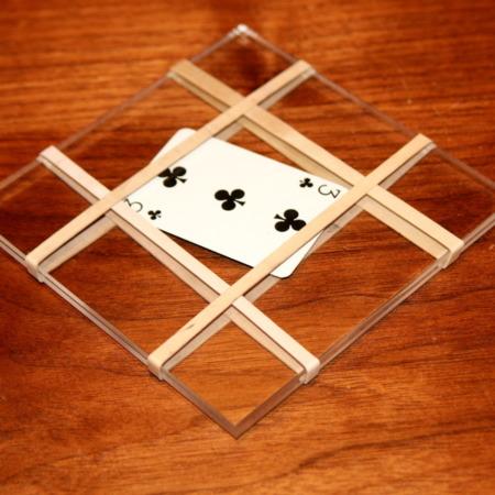 Effect: Plainly, it is the neatest, most appealing version of the card in glass you’l ever see. It’s just cards and glass. No stands. No other (visible) apparatus. The effect is, of course, ancient. Spectator seals two lucite plates together with rubber bands. A miniature card is then selected and returned to the deck. Spectator shuffles the deck. Then, as performer holds the lucite plates, the spectator is invited to toss the deck at the plates. He does so and when the cards have fallen, the chosen card is found sealed between the two plates. Spectator may open the plates to release the card.
