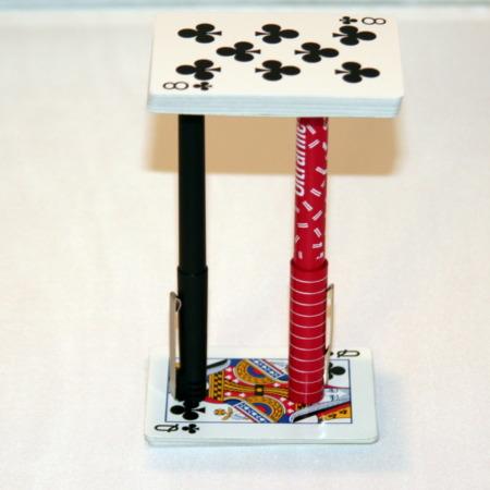 The magic begins. Carefully remove one of the pens. The cards remain suspended, just like in the Broom Suspension!! It looks great! Replace the first pen. Remove the top stack of cards, remove the pens and show everything!! A great close-up illusion. One you will perform a lot!!