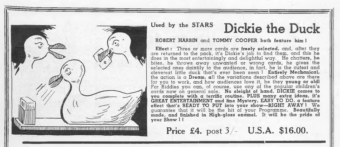 Effect: SHOWN AT our recent One-Day convention everybody said that this is the finest looking, most mechanically perfect Card Duck ever offered. A lovable looking chap who opens his beak and picks up FREELY selected cards in a manner which delights and amazes! No card skill is required. We have been working a duck for many many years and, during this time have collected a number of fine gags which make for really hilarious entertainment.