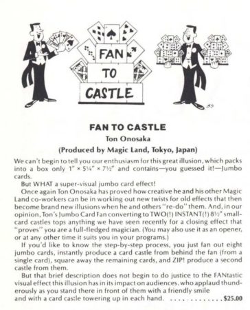 (c. 1980) (Submit Review) (Submit Update)Effect: WHAT a super-visual jumbo card effect! You just fan out eight jumbo cards, instantly produce a card castle from behind the fan (from a single card), square away the remaining cards, and ZIP! produce a second castle from them.