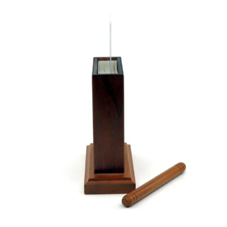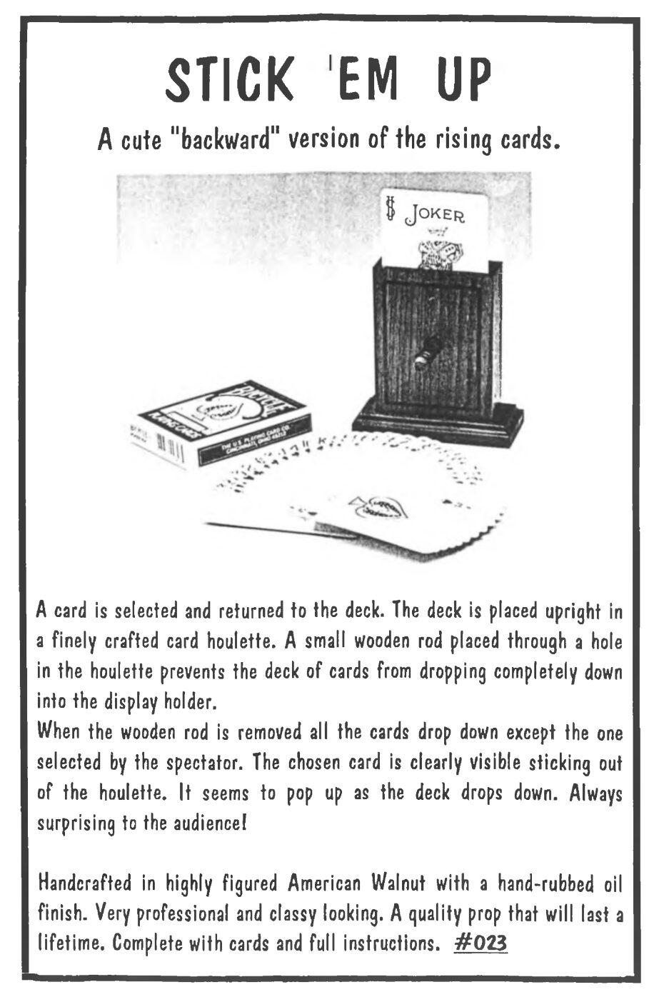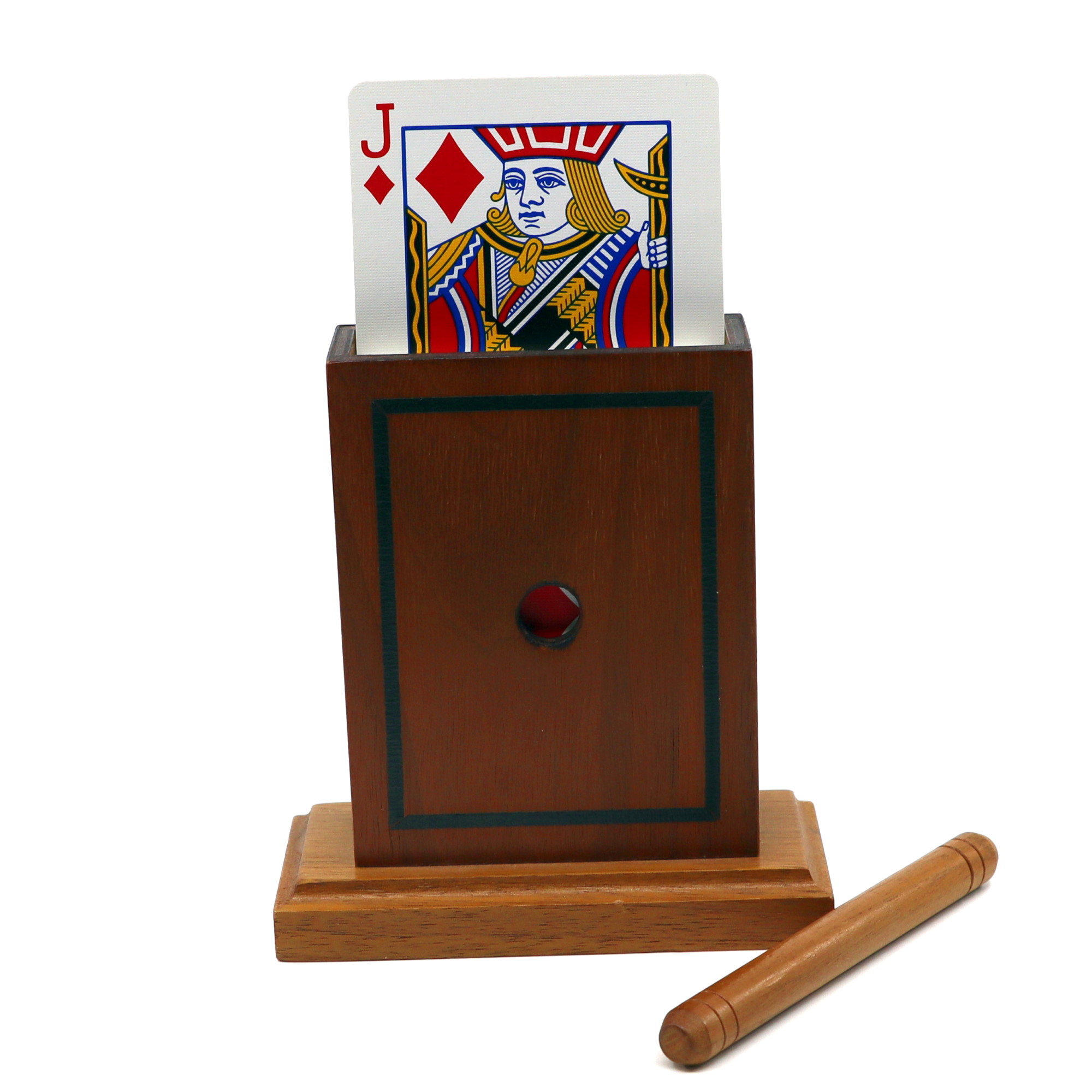 Effect: A card is selected and returned to the deck. The deck is placed upright in a finely crafted card houlette. A small wooden rod placed through a hole in the houlette prevents the deck of cards from dropping completely down into the display holder.