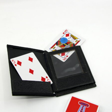 Effect: Performer opens a Wallet and displays a face-down card showing through a plastic window. This, he says, is his ‘Lucky Card’. Leaving the Wallet open on the table, he then picks up a Pack of cards. A Spectator is asked to choose one of the cards and show it to the rest of the audience, or sign it (whichever is more convenient at the time). The card is then shuffled back into the Pack.