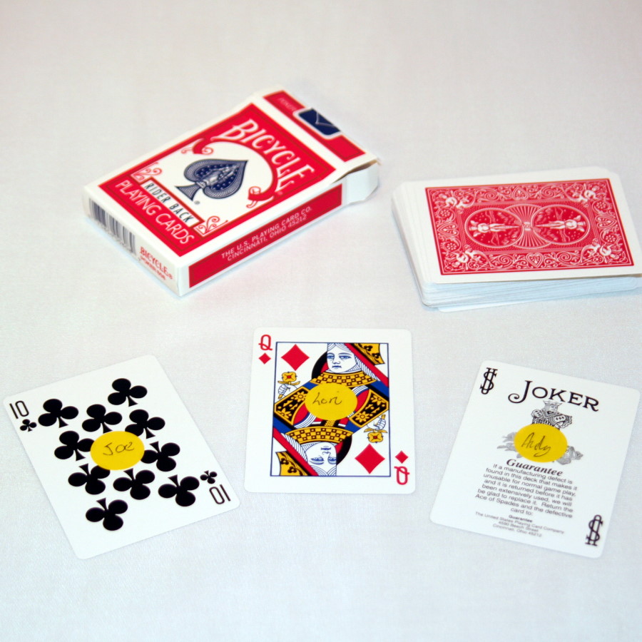 The magician signs his name on a sticker and places it on the face of his card. The two volunteers do the same thing. Their selected cards are replaced into the deck and the deck is inserted halfway into its case. The magician pushes the deck all the way and takes a pause. Then he tilts the case to slide out the deck.