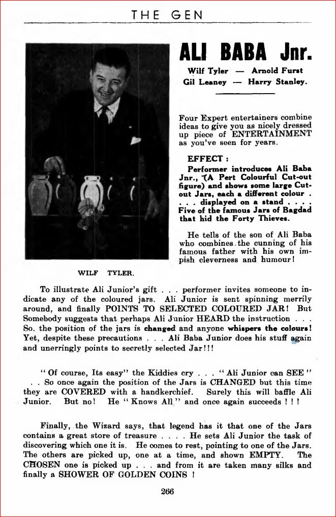 Effect: Five differently colored jars are shown and placed on a break down stand. Ali Baba. Jr., is introduced. A hole in Junior’s body permits him to be put on a metal projecting pieoe on stand. He is given a spin and stops at any color called for. At any time, the order of vases may be changed, yet Junior always picks out the right color. And for a climax, he picks out the one jar that contains treasure, etc. All the other jars are shown to be empty, but from the selected jar silks are produced and then a shower of coins comes pouring from the jar.
