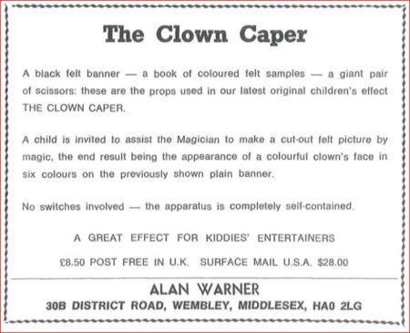 (c. 1973) (Submit Review) (Submit Update)Effect: A child is invited from the audience to assist the magician to make a cut-out felt picture by magic, the end result being the appearance of a colourful clown’s face in six colours on the previously shown plain banner. Large colourful props make this item very suitable for stage work and large audiences. The banner measures 28″ x 17″, the sample book contains 9 inch squares of coloured felt, and the “Magic Scissors” are 15″ in length, made of wood and finished in black and silver.
