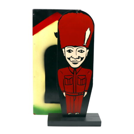 Effect: A cut-out shaped and. painted to represent a soldier stands on the performer s table. The soldier is seen to be wearing a red uniform and busby, and a cover decorated like a sentry box is placed over the soldier.