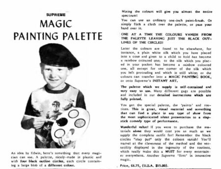 (c. 1982,1995) (Submit Review) (Submit Update)This clever idea was invented by Edwin Hooper and first released as The Magic Painting Palette by Supreme Magic c. 1982. When you first read the instructions it doesn’t sound that great but in practice the prop works well and is very effective.