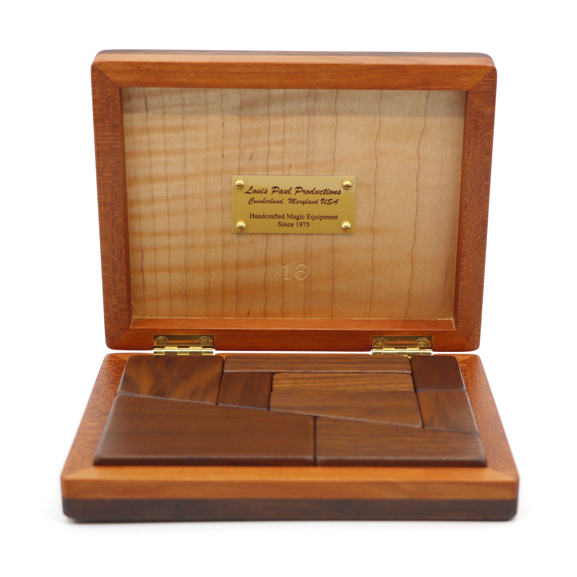 Effect: A decorative bag is brought forth and a wooden case is removed. The case is opened and shown to contain a wooden, rectangular puzzle. The puzzle pieces are removed from the case and reassembled onto a flat surface into the same rectangular shape. Showing their hands empty, the performer reaches into their pocket to remove a small bag. From the bag, a small square puzzle piece is removed.