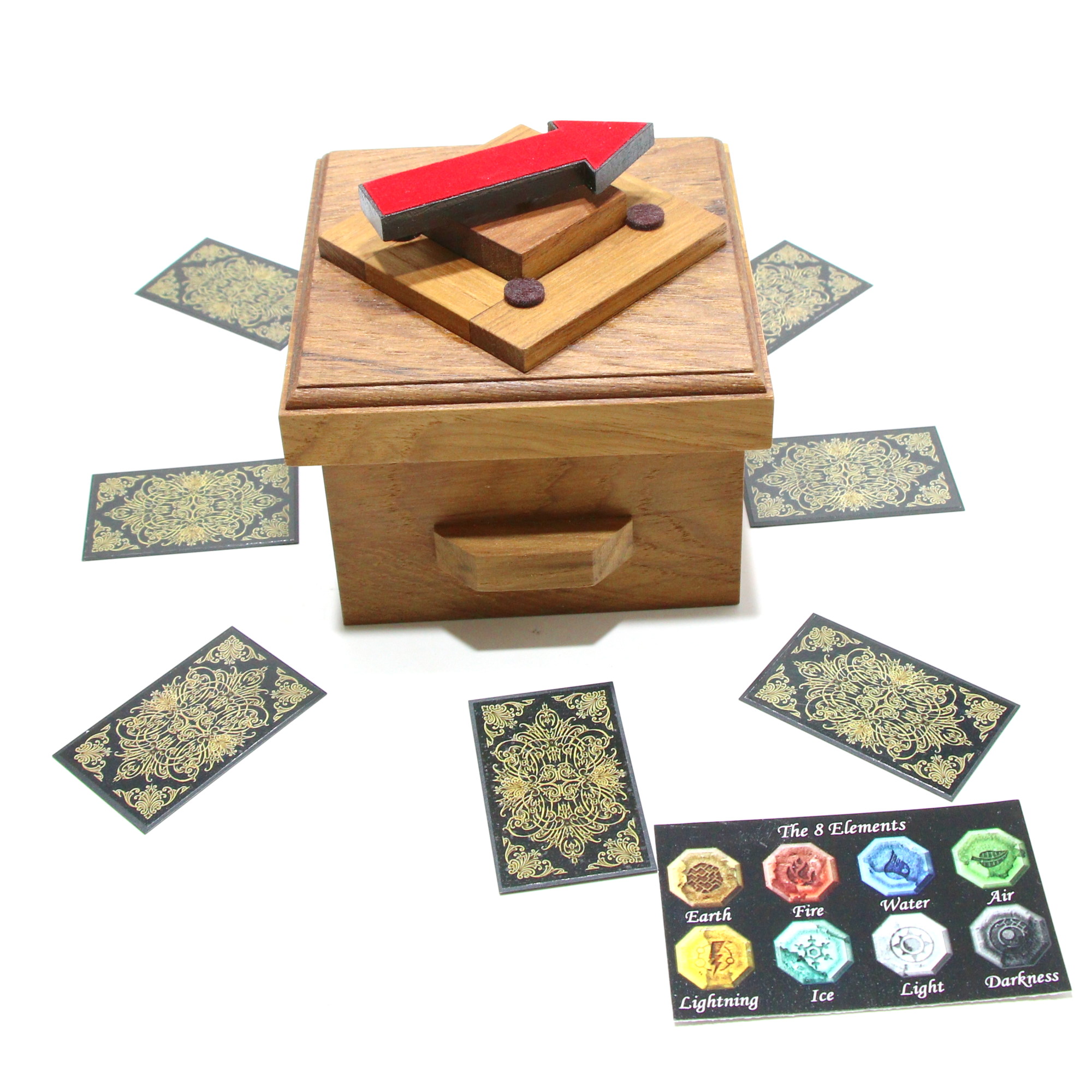 Effect: The performer shows an elegant wooden drawer box along with a pack of 8 slightly aged element cards. Two cards are then chosen by the spectator with absolutely no force of any kind. The spectator is then asked to shuffle the chosen cards along with the six other ones. These eight cards are then randomly placed face down around the box. Now, a small stand and a wooden arrow are removed from the drawer and placed on top of the box. The arrow is then given a spin and after a few second, the arrow stops pointing to one card. It is of course one of the cards that was selected by the spectator!