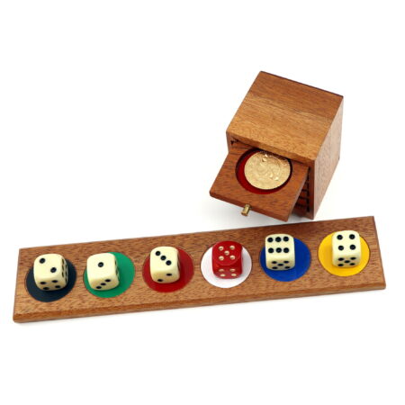 The effect uses a wooden panel with six colored slots, five white dice and one red die, and a really nice wooden cupboard with six drawers that hold coins. The bottoms of the drawers have a color that matches with the wooden panel.