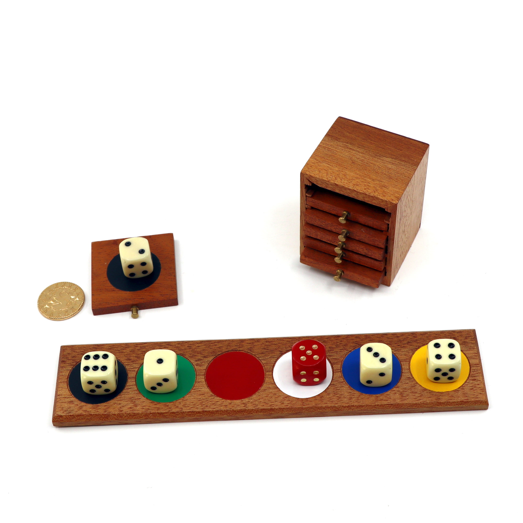 The spectator then arranges the six dice into order and they are placed on the colors on the wooden platform. Now through a process of elimination the spectator slowly eliminates one dice after another and as they do they remove the corresponding drawer from cupboard and each time there is a small golden coin.