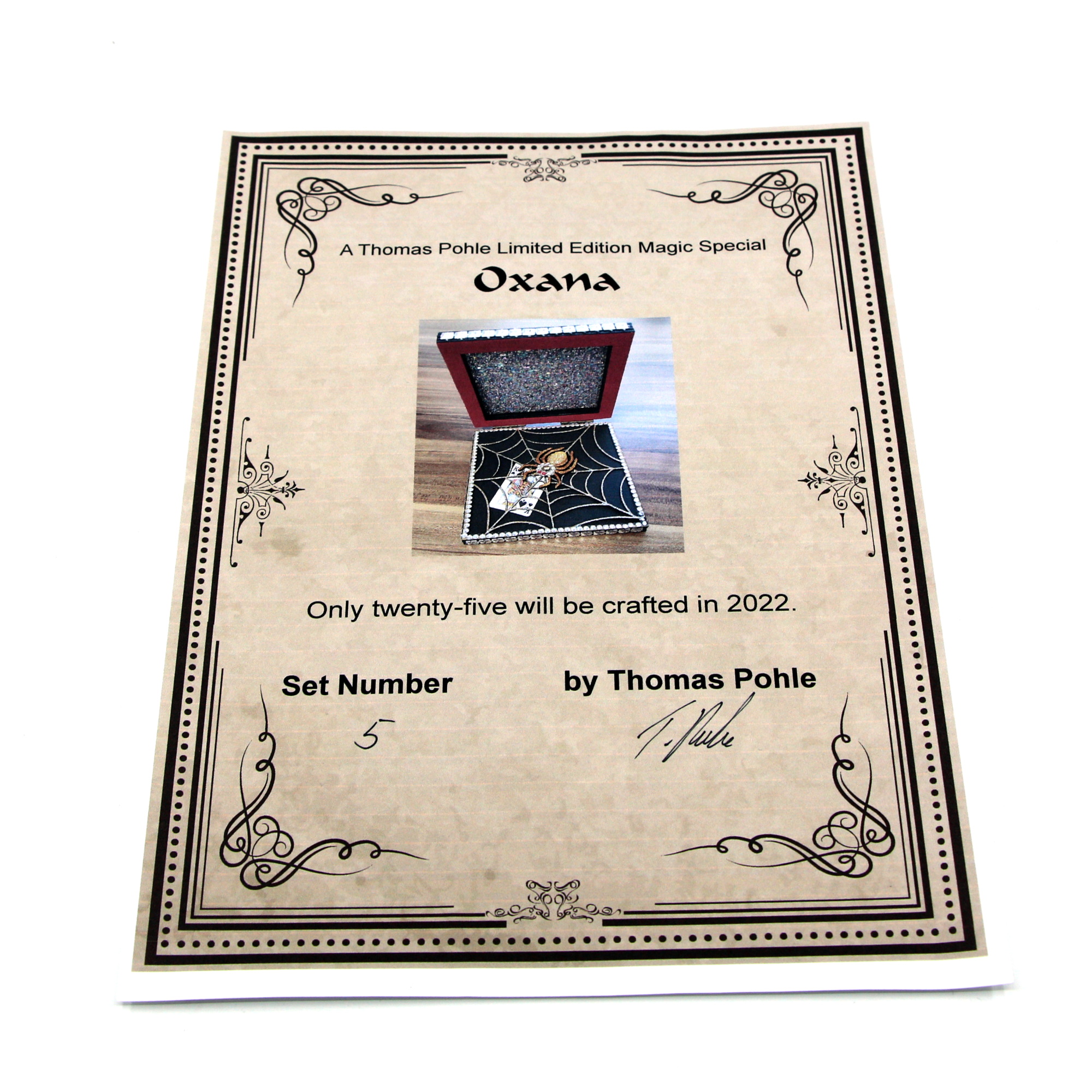 Effect: A beautiful and ornate box is shown and inside a heavily jeweled spider named Oxana is shown. Oxana is sitting on her web and ready for action. From a small deck of cards a card is chosen (yes it is forced) and shuffled back into the deck. The performer then asks Oxana to reveal the card and in her excitement the card appears inside her web but face down. The performer is disappointed with Oxana, but explains this is her first time and she will do better (he hopes!) The box is closed again and a magical pass is made and this time the card appears face up and it is indeed the chosen card.