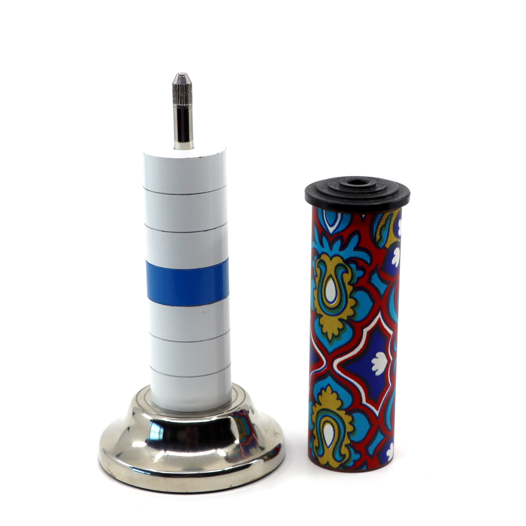 Effect: The standard effect is clean and simple: Several separate checkers are stacked on the rod with the blue one at the top. They are then covered by the cylinder. Upon lifting the cylinder, it is seen that the blue checker has mysteriously moved to the center of the stack! The cylinder is replaced and it once again removed only to find the blue checker has melted all the way down to the bottom of the stack! The checkers are then removed one by one and shown once again to be just seven solid and separate checkers.