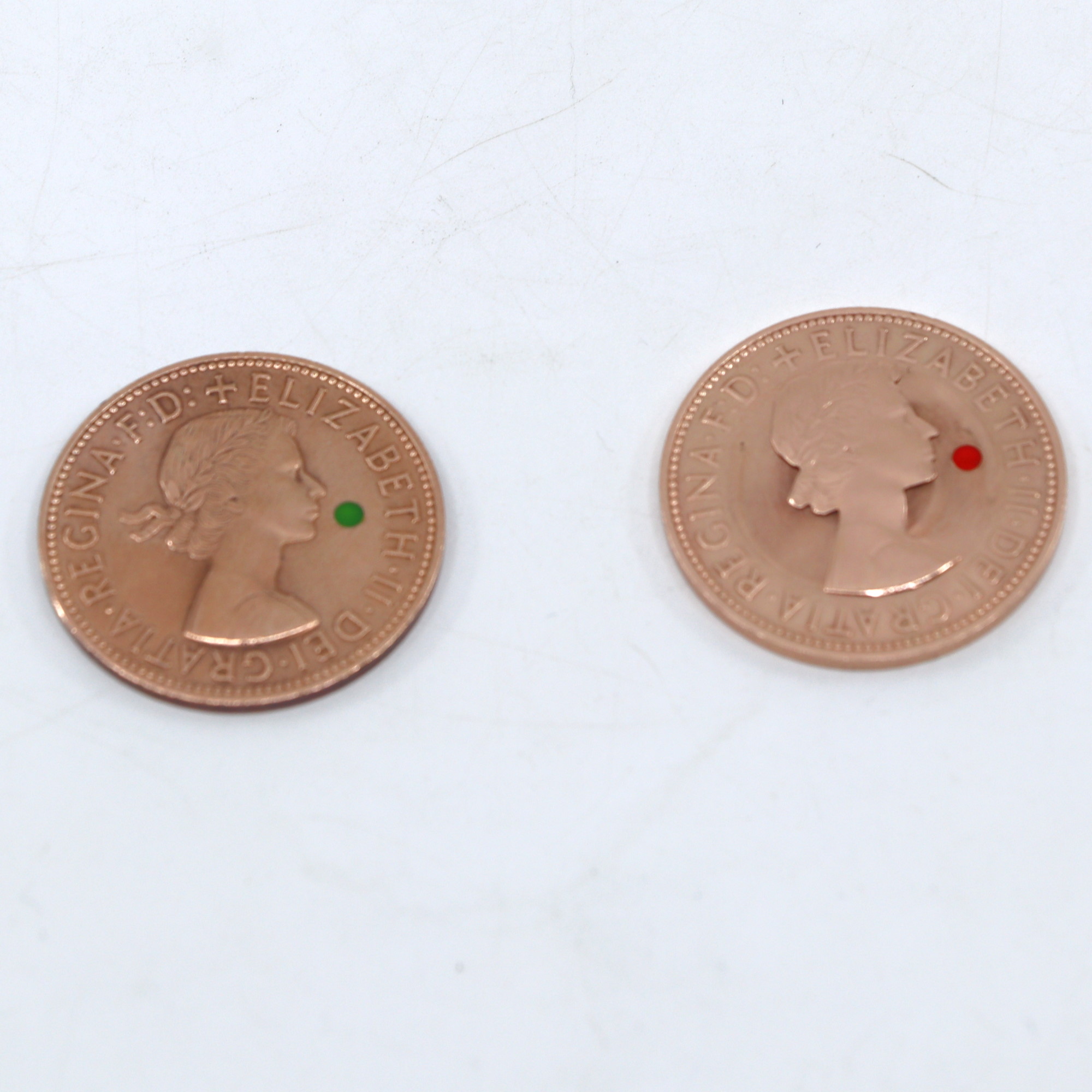 Effect: You’ll drive them crazy with this one. Two coins, each marked with a different colored spot, CHANGE PLACES in a most bewildering manner … several times … even in their own hands.