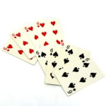 Four identical cards are shown to have the same faces and backs. Four different cards are shown to have identical faces and backs, which clearly contrast with the first four. When the two packets are put together and only two of the cards intermixed, all the cards magically intermix. The packets are separated … when the cards are turned face down and spread, each packet now has totally different colored backs.
