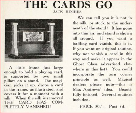 Joe Berg also claims to have invented it with his Mysto Card Frame. But I have found nothing else to say that Jack Hughes did not invent Card Go, including many ads and reviews from the 1940’s and later, and of course Jack Hughes’ World of Magic Books.