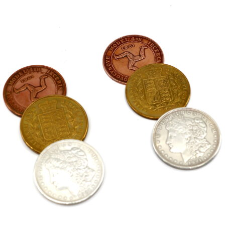 On the video is quite a variety of uses for this gaff set. There were a couple matrix effects that just totally smoked … one, starting with 4 different ungaffed coins, having them all arrive in one corner, immediately backfire, and then end completely clean. He had several color changes where you would show a copper coin, wipe it to a brass coin, wipe again to a silver dollar as you pick it up and show both sides … a lot of cute little things like that.