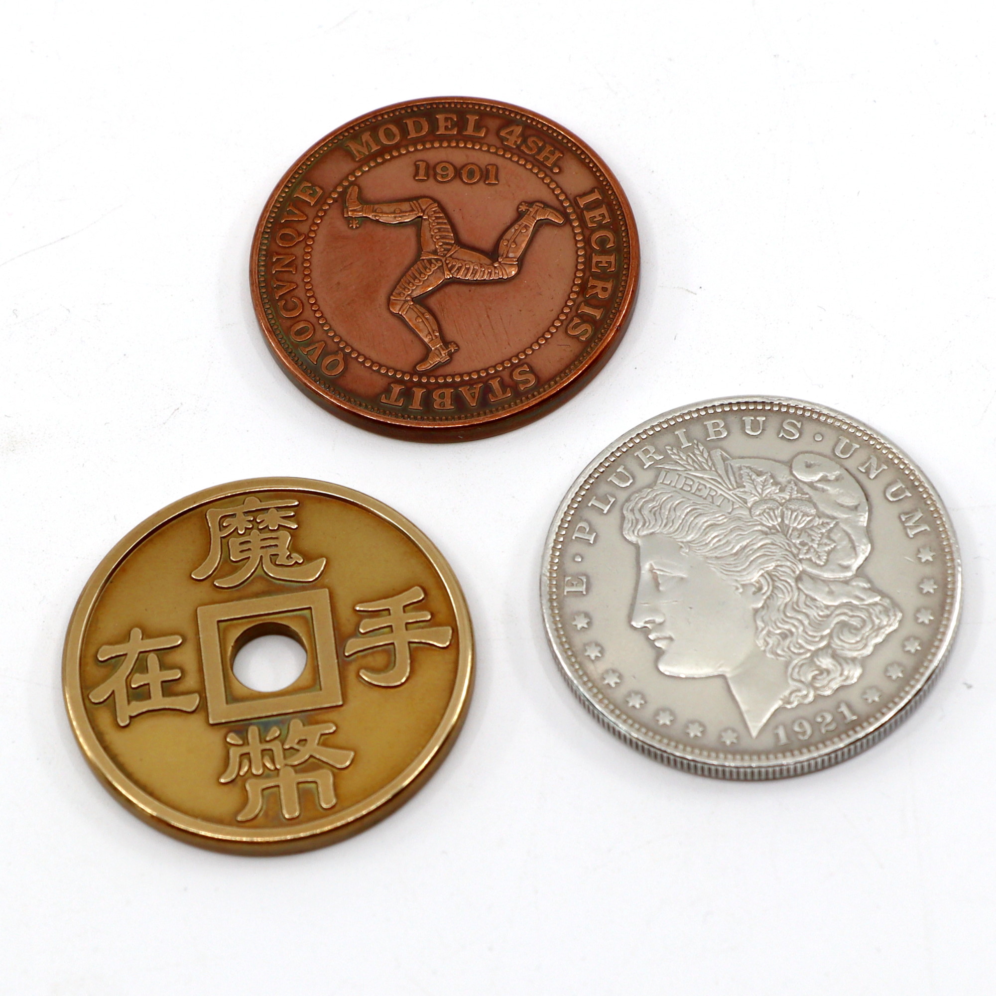 Cerberus comes with my absolutely utmost precision made gaffs and the 3 matching ungaffed, pristine coins. This Deluxe version has a matching Chinese Coin and shell that can be used to replace the Victorian Crown if desired or as a stand alone Chinese Coin.