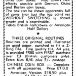 My contribution, apart from the new routines and handling, is to have developed a new faked coin. This fake, hereafter called the Chinese ‘See-Thro’ fake, enables us to show the spectators a box which apparently contains several large silver coins and a Chinese coin. They can see the top silver coin through the hole in the Chinese coin. Yet the box is empty and can be left on the table for examination.