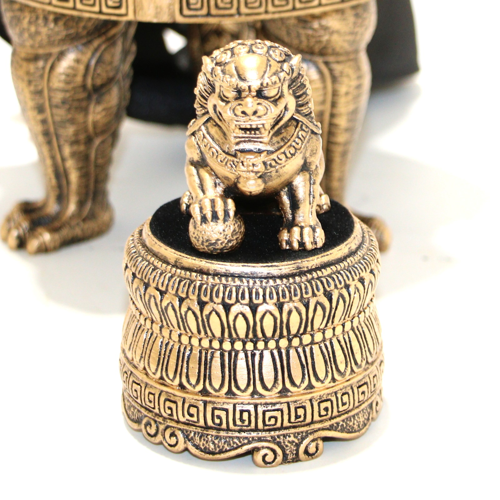 The Chinese Lion Mystery measures approximately 13.5cms in diameter and 16.5cms high including the tube. The round platform is only 13mm thick and adorned with three beautiful lion paw carved legs. The entire outfit is extremely detailed and each set has been painstakingly and individually hand-crafted by our own exclusive artist.