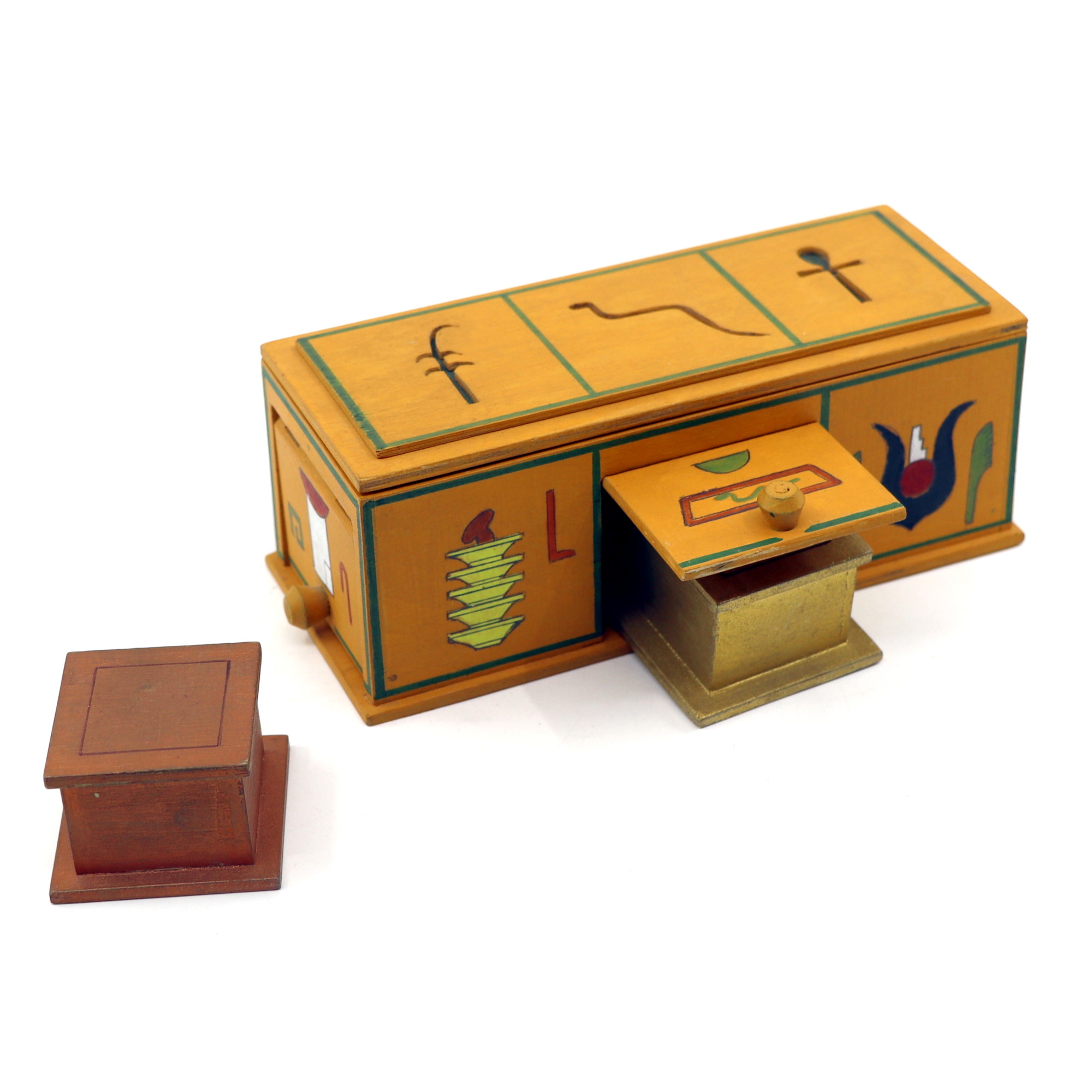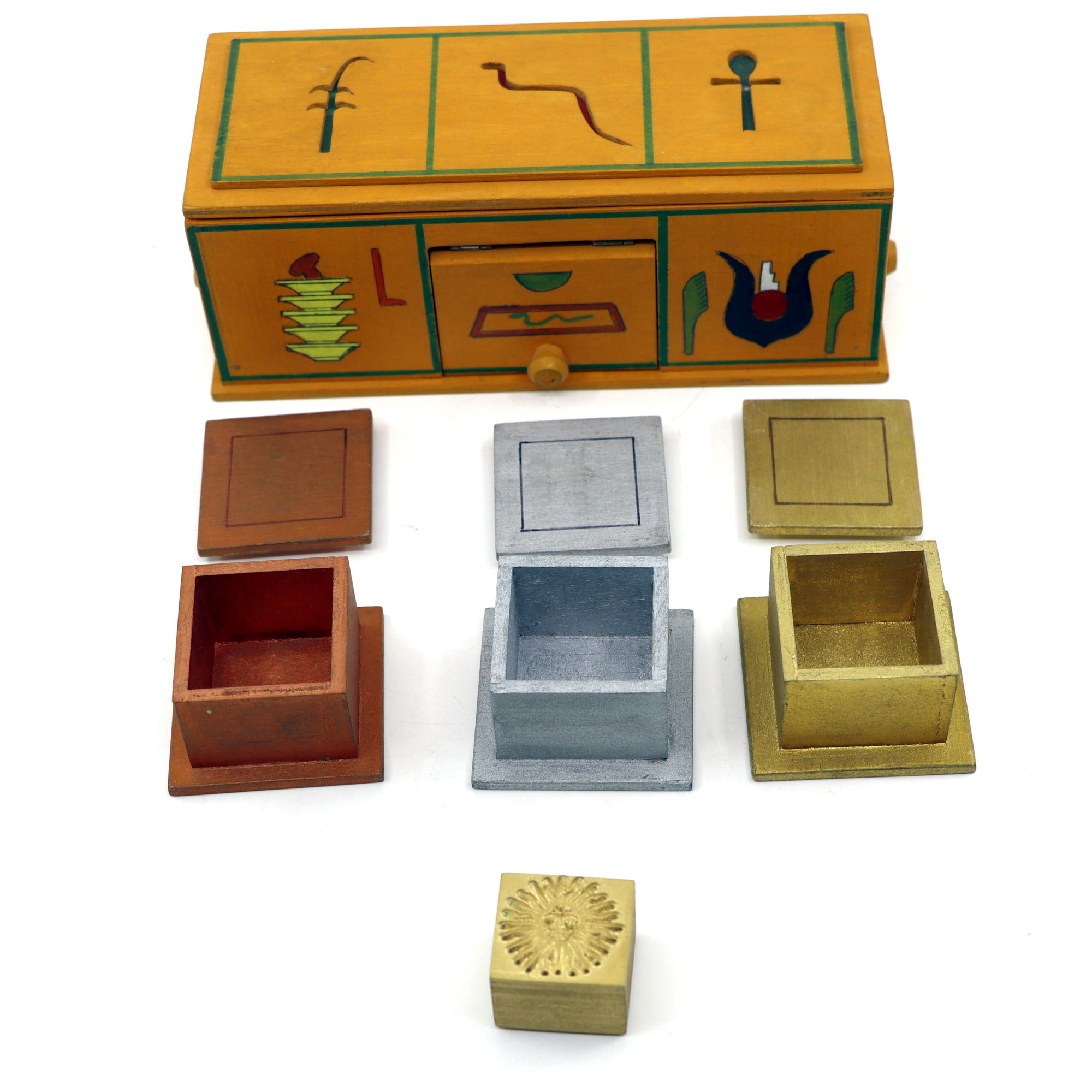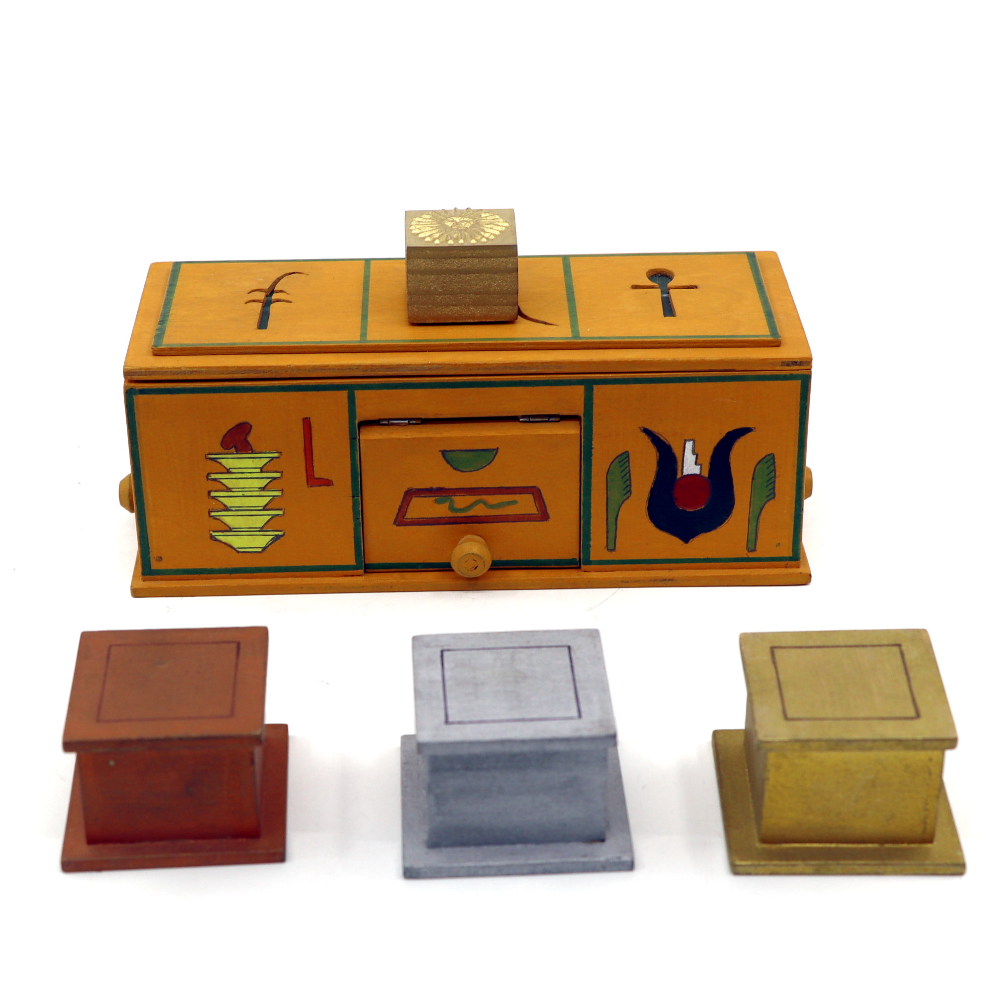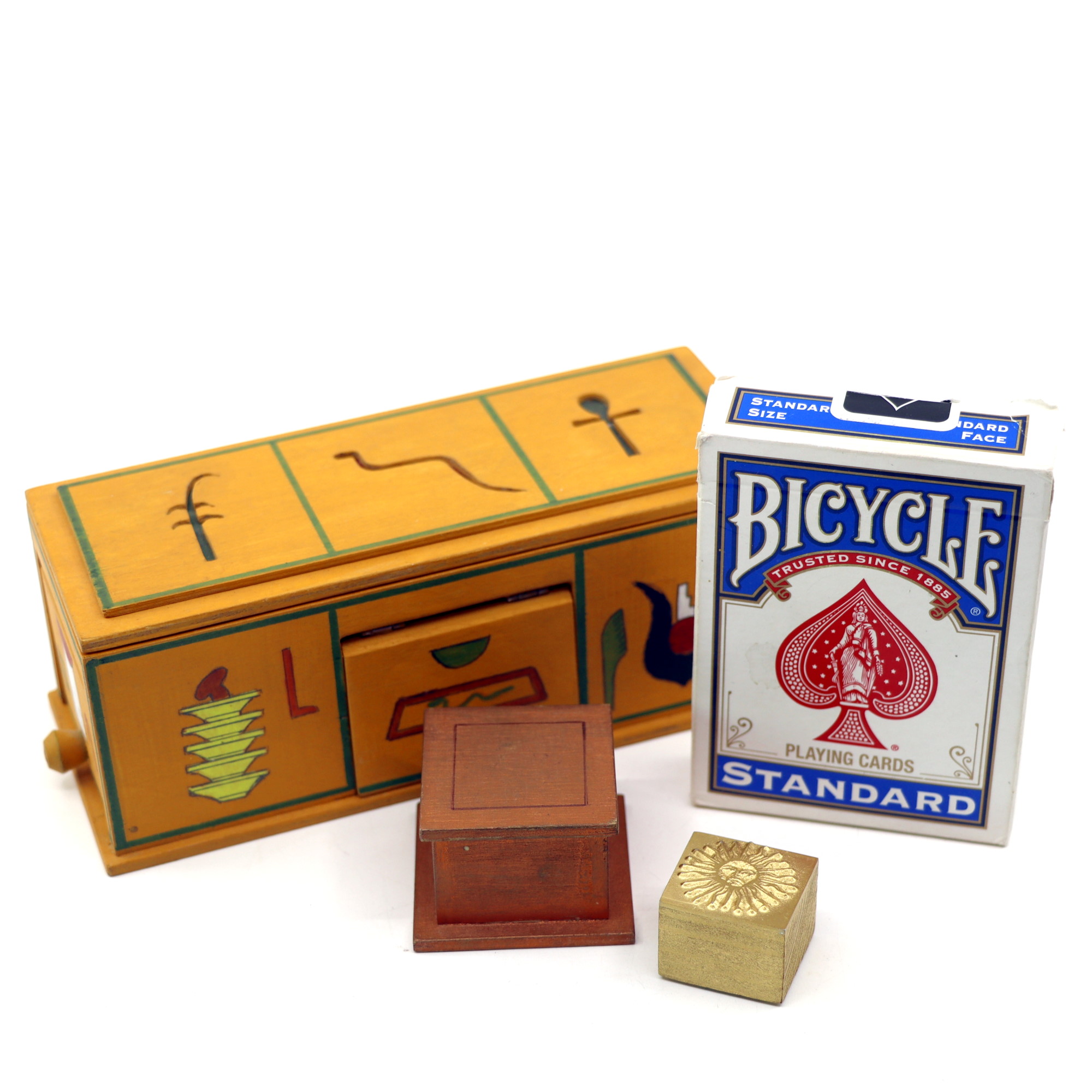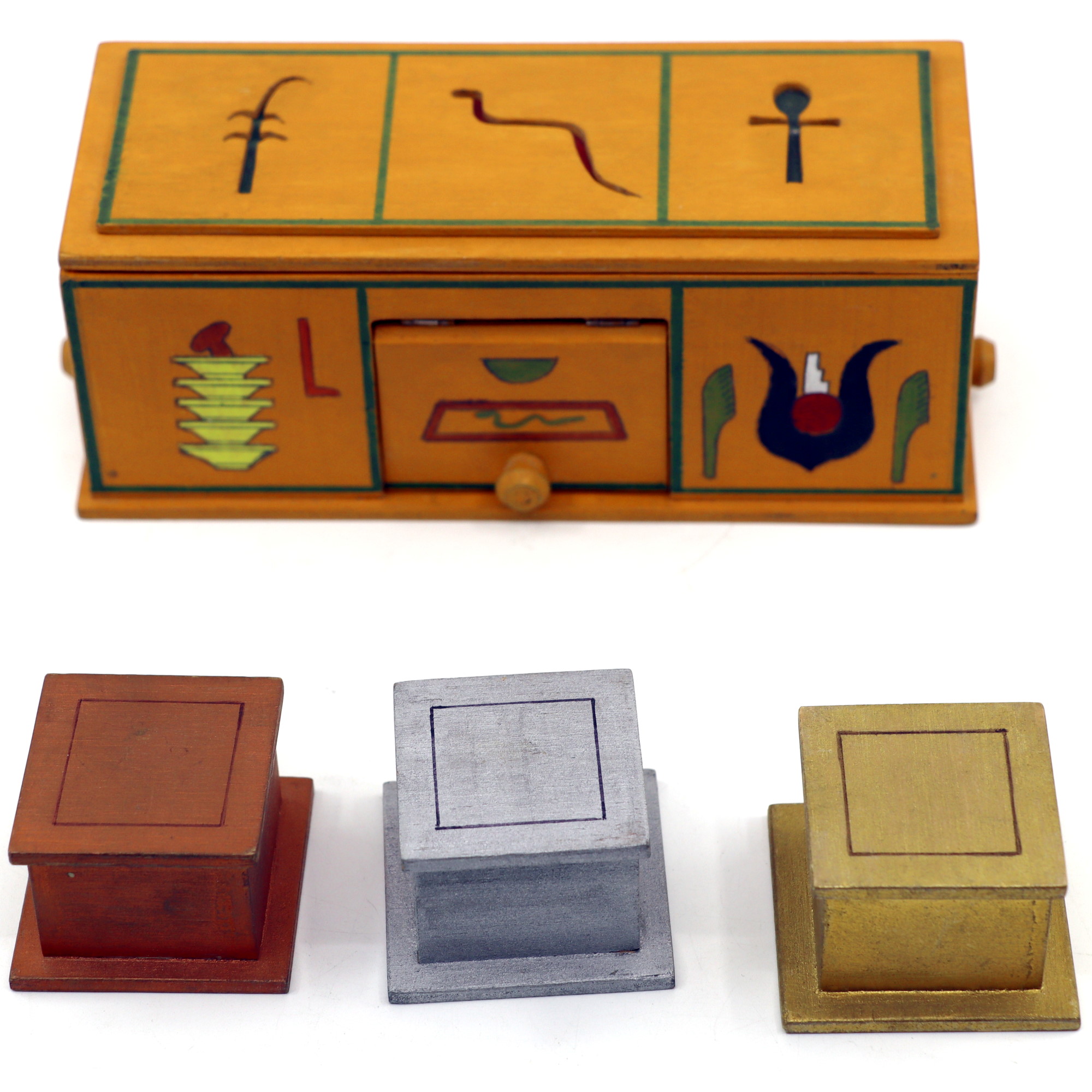 A spectator is presented with a “golden” cube. After the performer has left the room, the spectator is asked to place this cube in one of the containers and place all the containers into the sarcophagus as desired, then close the doors.