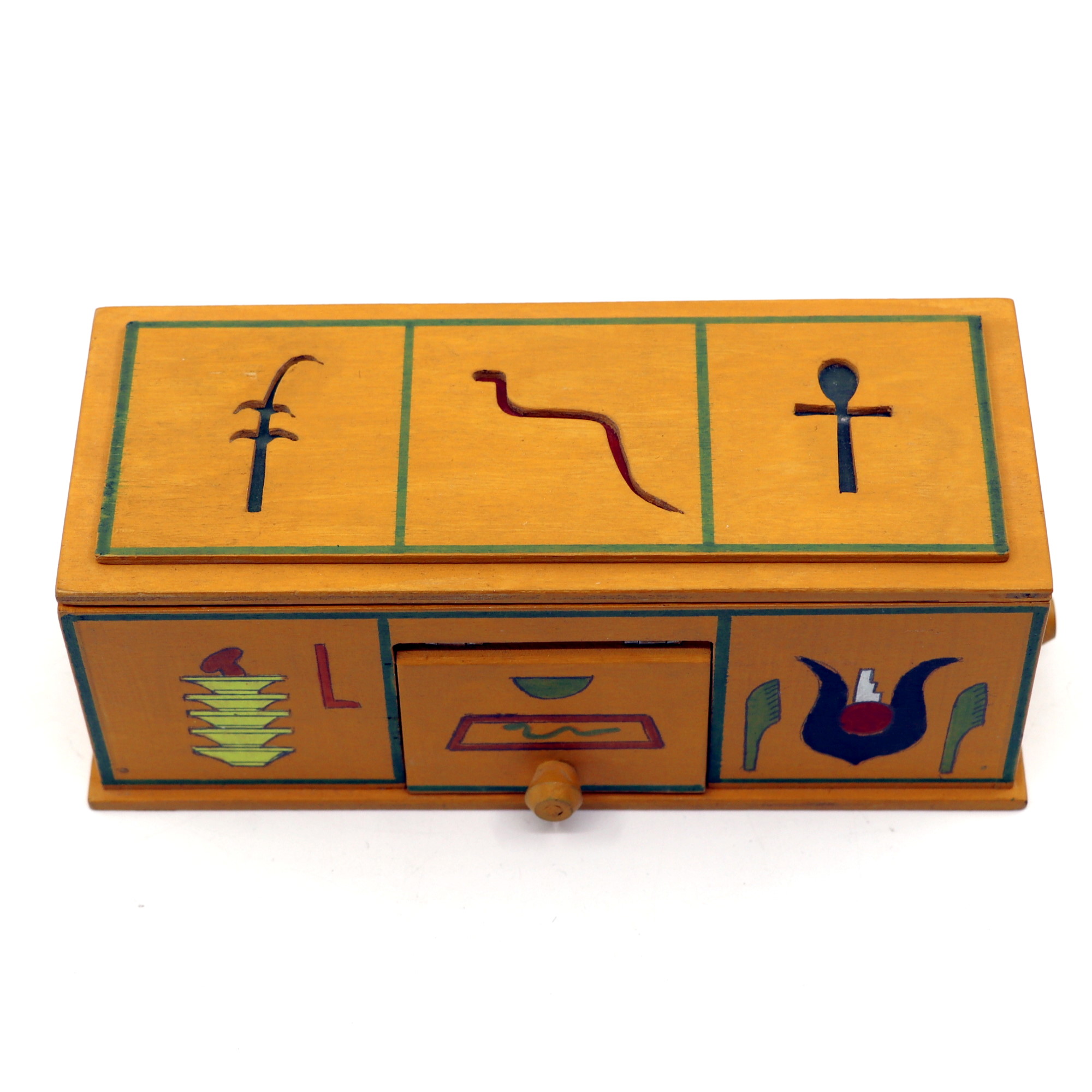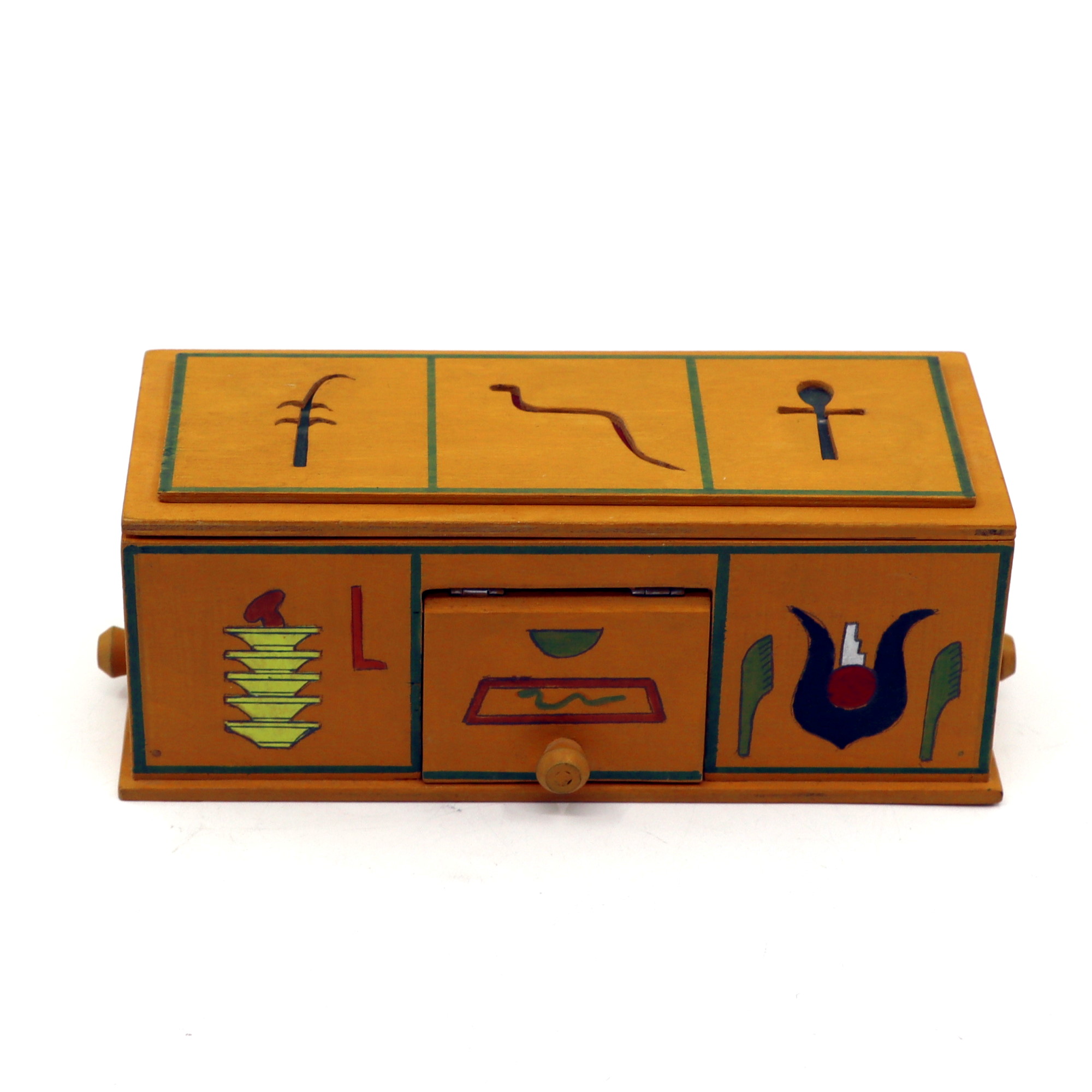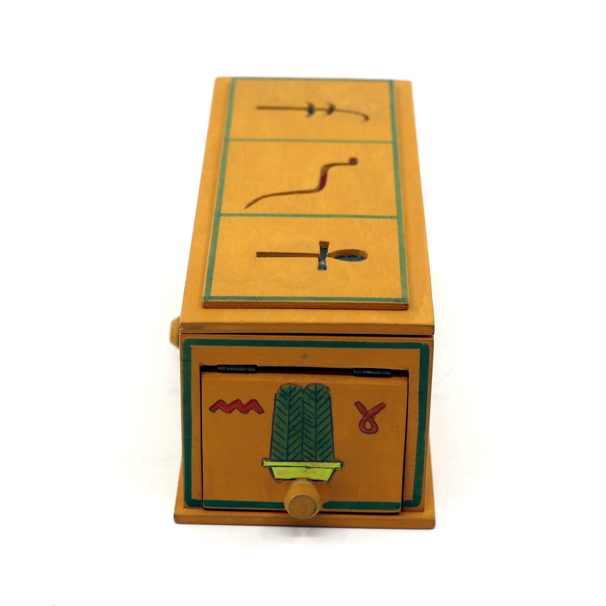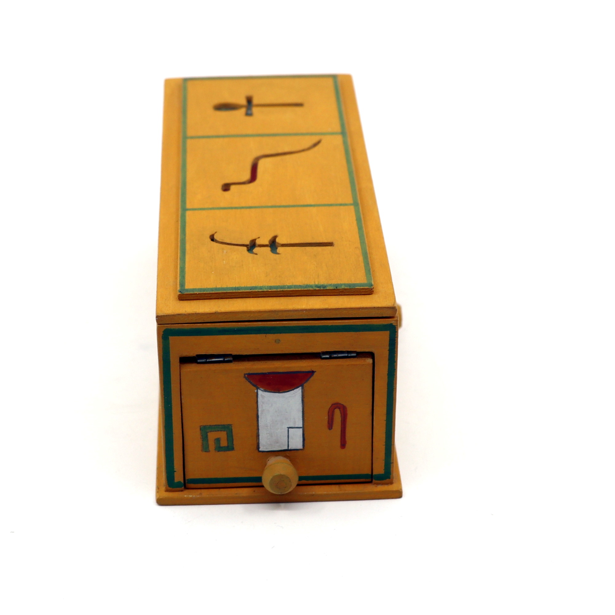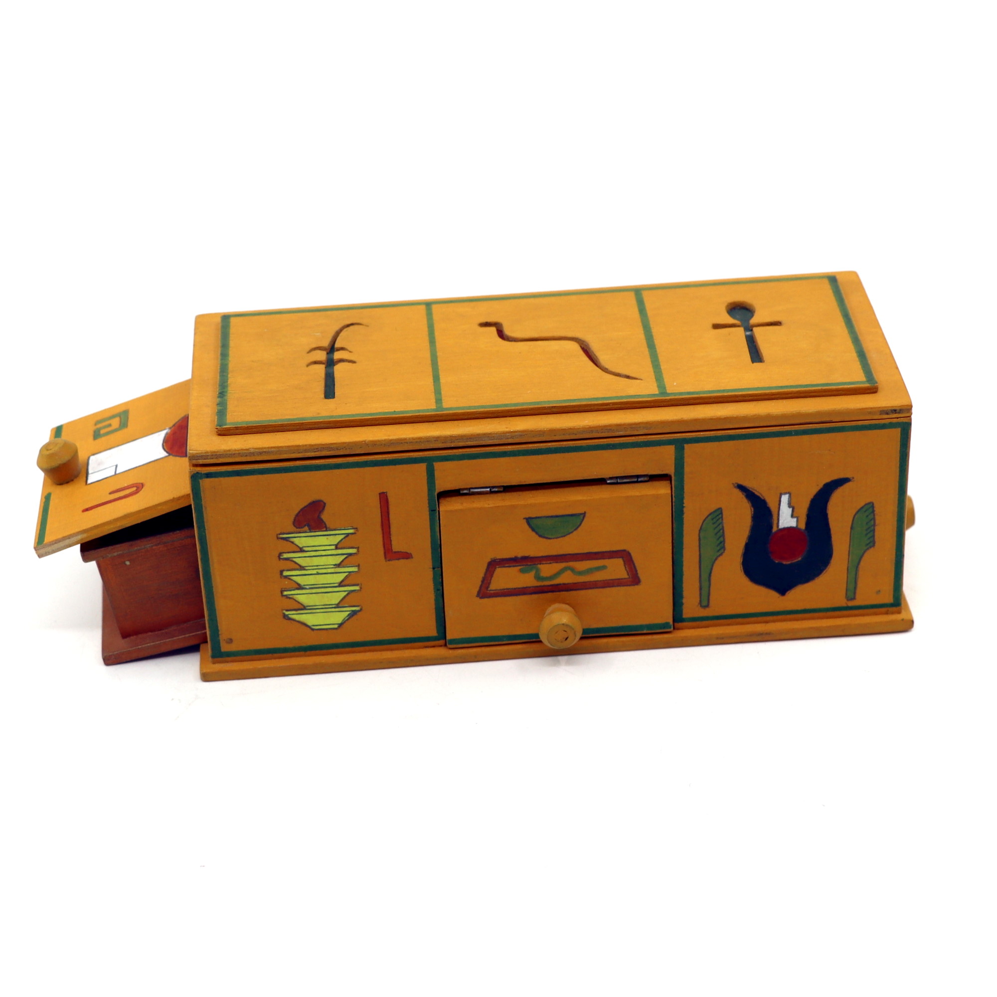 A spectator is presented with a “golden” cube. After the performer has left the room, the spectator is asked to place this cube in one of the containers and place all the containers into the sarcophagus as desired, then close the doors.
