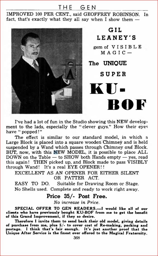 (c. 1947) (Submit Review) (Submit Update)This was developed when Jack Hughes was working with Harry Stanley (as Jack Hughes and Harry Stanley in Peckham, London SE15) c. 1947. Jack built two versions of this item the more traditional Ku-Bof and this one with the Clock face called Clock Off. It is featured in his World of Magic Vol. 2. It was shortly after this was created c. 1948 that Jack and Harry parted ways and they both ran their own companies, Jack moving to Colindale, London and Harry staying in Peckham. When Jack left he took all of his effects with him, and Harry advertised a new version of Ku-Bof as Gil Leaney’s Ku-Bof after some improvements were made.
