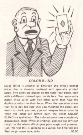 The magician says that when his friend tried it he named every color wrong. His problem was not that he had a bad memory, he was COLOR BLIND. As performer says this he turns the cards over and instead of colors on their faces, there are letters and they spell COLOR BLIND.