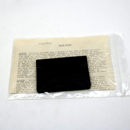 (c. 1977) (Submit Review) (Submit Update)Effect: Magician explains that a friend of his took a memory and color test at one of the local schools. He shows a packed of cards. He says they used ten cards, like these. Each one has a color on its face … there are five different colors, two of each.