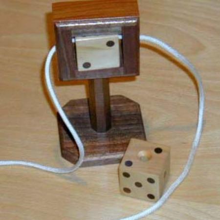 (c. 1998) (Submit Review) (Submit Update)Effect: A small frame on a stand is shown, along with a wooden die. The die is placed in the frame. A cord is passed through a small hole on one side of the frame, through a matching hole through the center of the die, and out another hole on the opposite side of the frame. Thus, the die is effectively locked in place within the frame. This arrangement is shown on all sides and then set on the table. The ends of the cord are placed in front of a spectator and he is asked to place a finger on the ends. The magician covers the frame and die with a handkerchief, then reaches under the handkerchief with both hands. Within a few seconds, he removes the handkerchief, and the die is seen to be resting on the table in front of the empty frame, free of the cord, while the cord remains threaded through the frame. All may be examined.