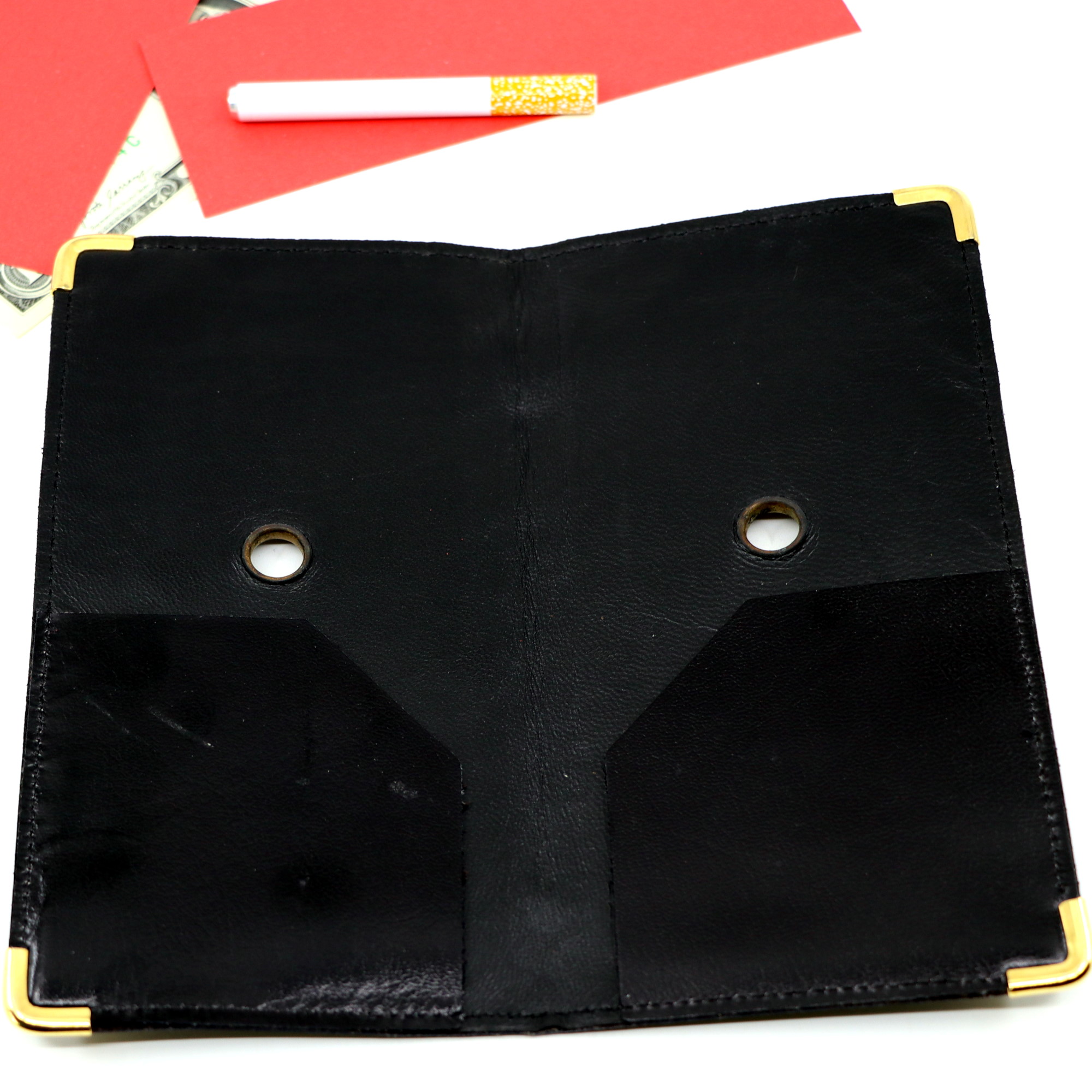 THE WALLET: Is made of real opening the wallet the bill is found there is a hole in the paper. Bill right away. _ pigskin and provided with brass corners. This wallet you can use not only for the trick but also to keep your money in. The wallet is black and measures about 3×7″.