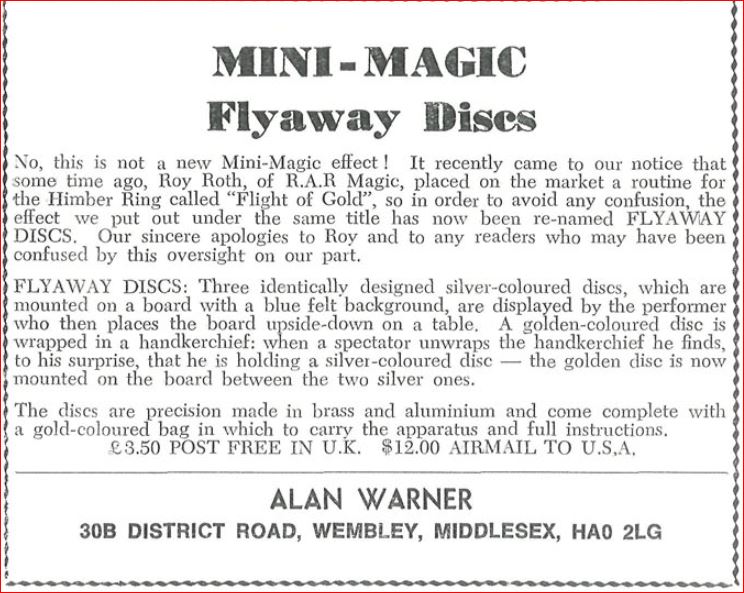 This effect was renamed Flyaway Discs in December 1972 as Alan realized it clashed with the name of an effect called “Flight of Gold” released by Roy Roth of R.A.R. Magic (c. 1970).