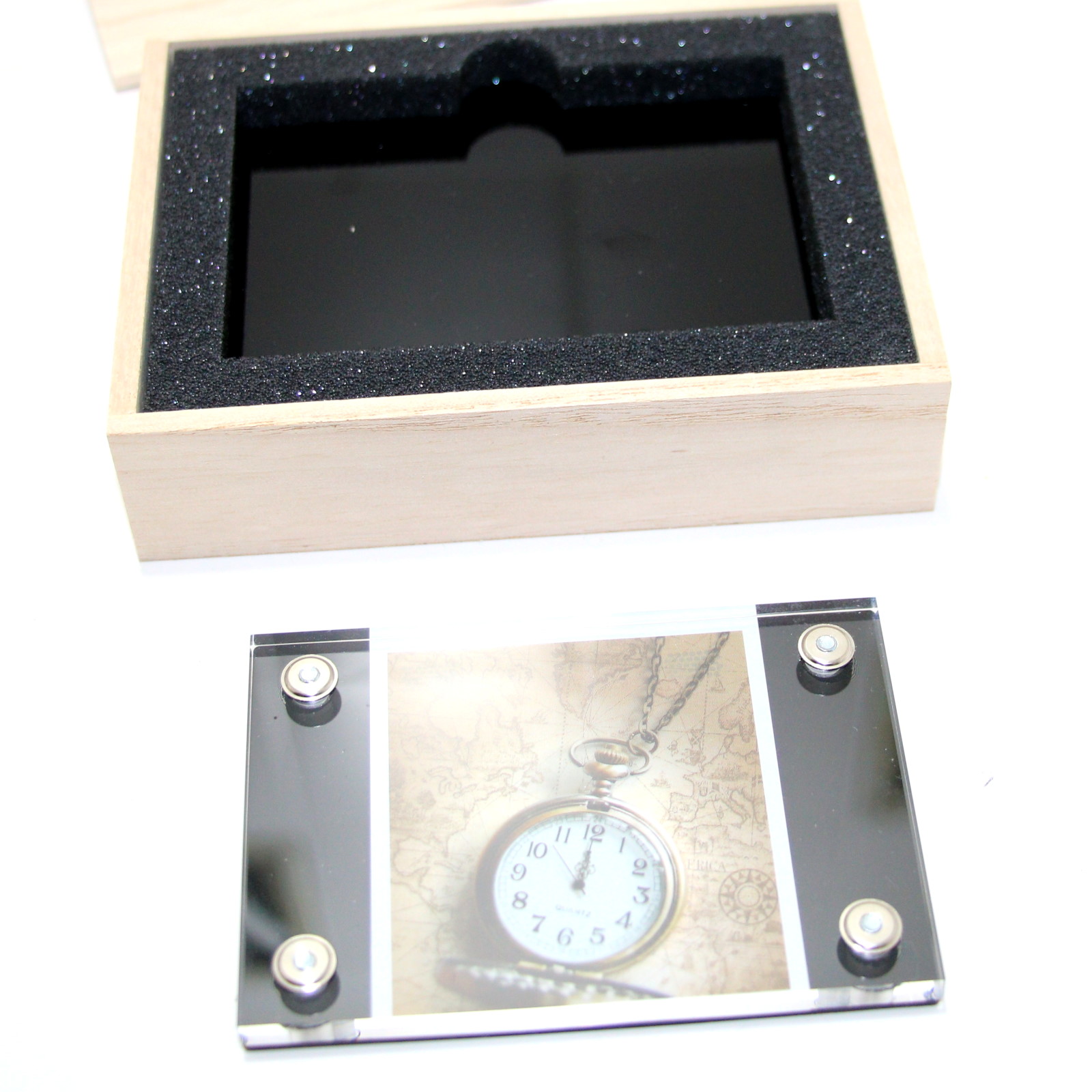 the spectator to open the wooden box. There is the photo frame inside the box, and inside the frame is a photo of a pocket watch. The time on the watch photograph is the exact same hour chosen by the spectator!