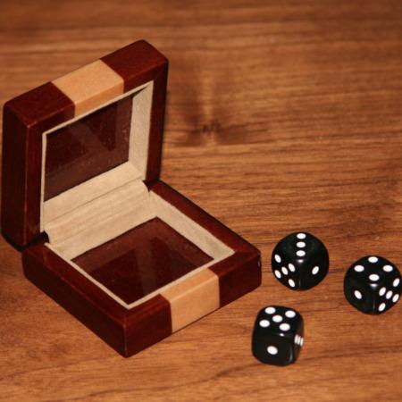 A beautiful box and two black dice are shown. Both of the dice are then placed inside the box which is then closed and given to the spectator to shake. The spectator is now asked to open the box and add up the total of the numbers showing. The dice are shaken two more times, by the spectator, and each time the total showing is added to the previous total. The performer, who at no time sees any of the totals on the dice, is able to reveal the final total arrived at!