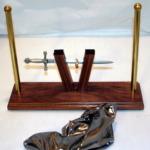 “Legend has it that the family of a fallen Templar would receive a replica of his sword. Mounted in a fixture such as this, it was kept in a prominent place in the family home. For the most part, the display would be cloaked in a protective cloth. (Performer places a silken bag over the display.) On ceremonial occasions, the bag would be removed, and as a gesture of continuing homage, loved ones would remove their rings and place them on the sword. Recently discovered writings suggest that, from time to time, examples of psychokinetic’s would be observed. It’s my intention to attempt such an experiment.”