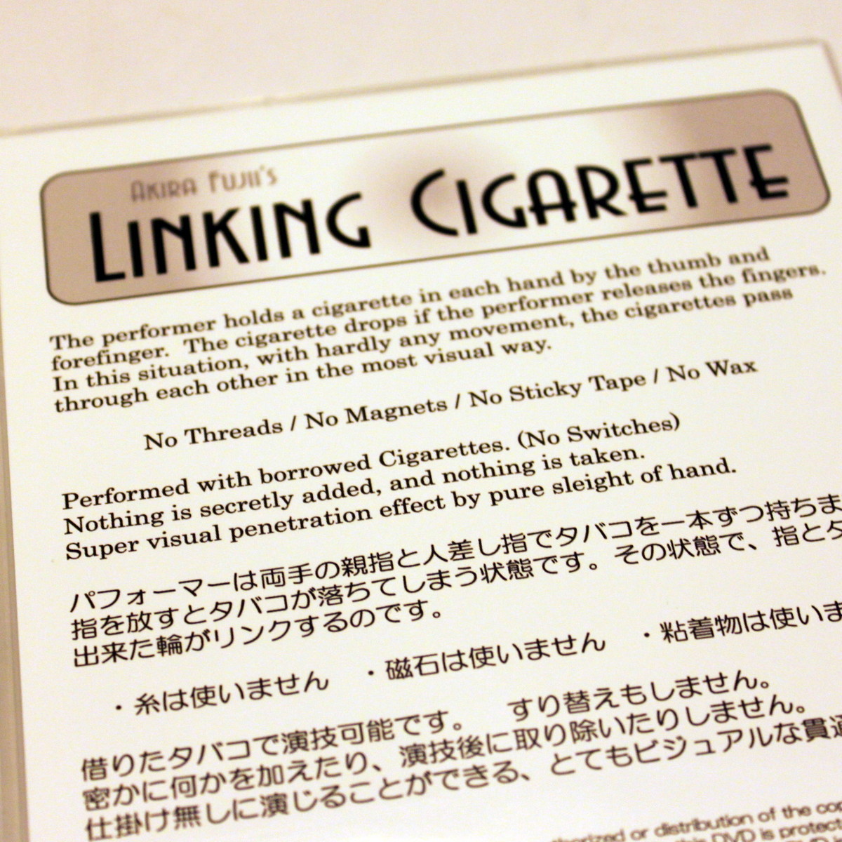 (c. 2010) (Submit Review) (Submit Update)Effect: The performer holds a borrowed cigarette (or small twig) in each hand by the thumb and forefinger. The two objects pass through each other like REAL MAGIC! No Switches, Nothing is added or taken away. A Super visual penetration of two objects! What you see on the demo video is how it looks live! Perform anywhere!