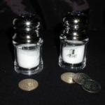 But if you want to produce coins seemingly at will beneath the salt shaker without sleight of hand then this is the outfit that is meant to do it. And when I first tried it out, I tapped four times and each time one coin appeared and I thought wow, this is cool! Unfortunately, as I played with the props more sometimes no coins appeared and other times two or three appeared. So the skill required is knowing how hard to tap. Unfortunately I fear that you will always be worried about the wrong number of coins appearing.