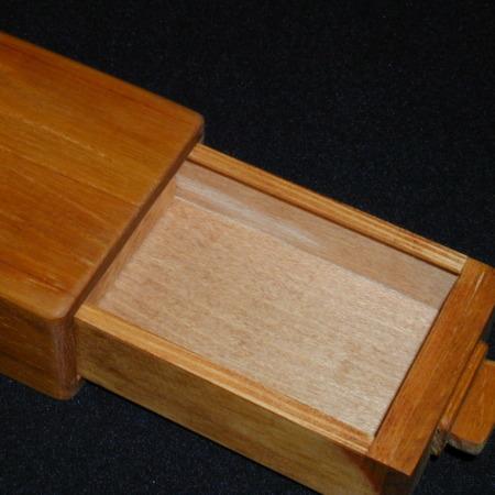This is a great drawer box from Alan Warner. One of his earliest works, so it lacks some of the ornateness of his more recent creations. However, as a wonderful and functional drawer box it is superb. Unlike many drawer boxes there are no outward signs of holes or levers or pins and you don’t need to tilt the box one way or another – it is much cleaner than those methods. Whenever Alan applies his talents to even the simplest of devices he always comes up with something a little better. This drawer box is no exception. In fact, it is so well built that you could have a member of the audience open it up to show the load appear!