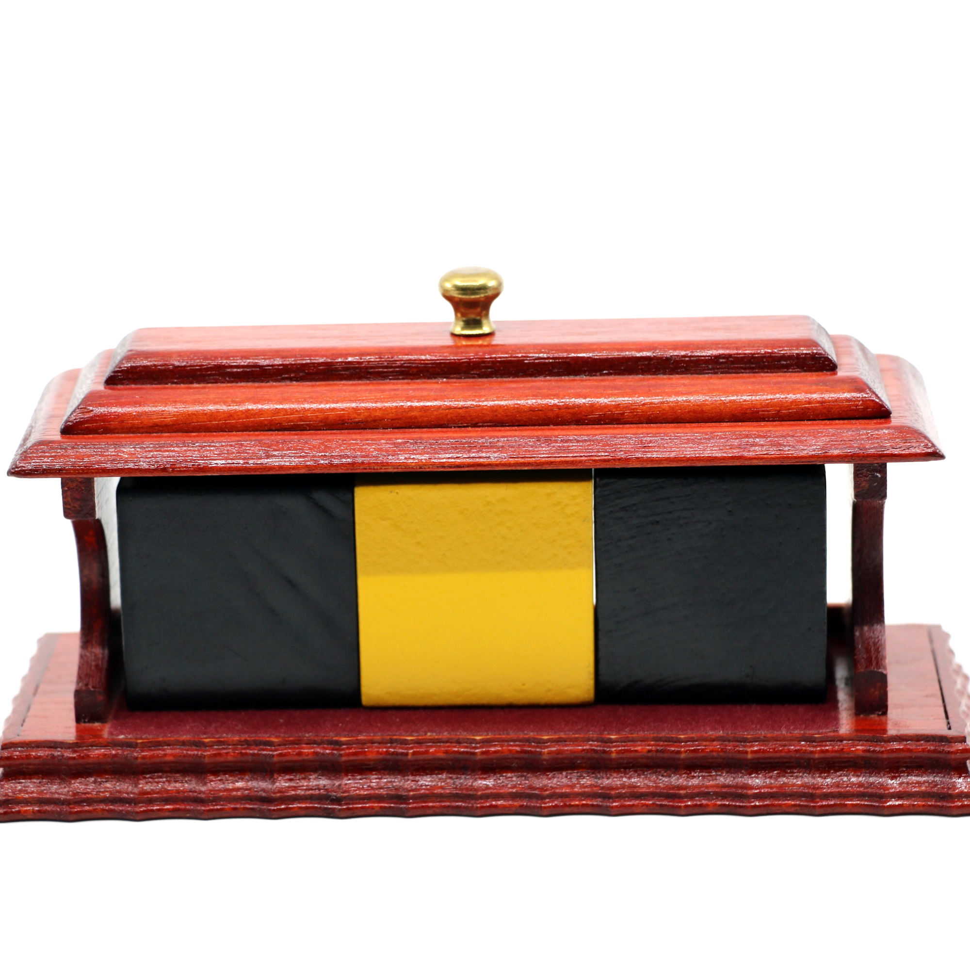 Effect: Magician shows a neat case in which are three blocks — two black and one yellow. The blocks are removed and may be thoroughly examined. The case has neither front nor back. The blocks are replaced with the yellow block between the two black ones.