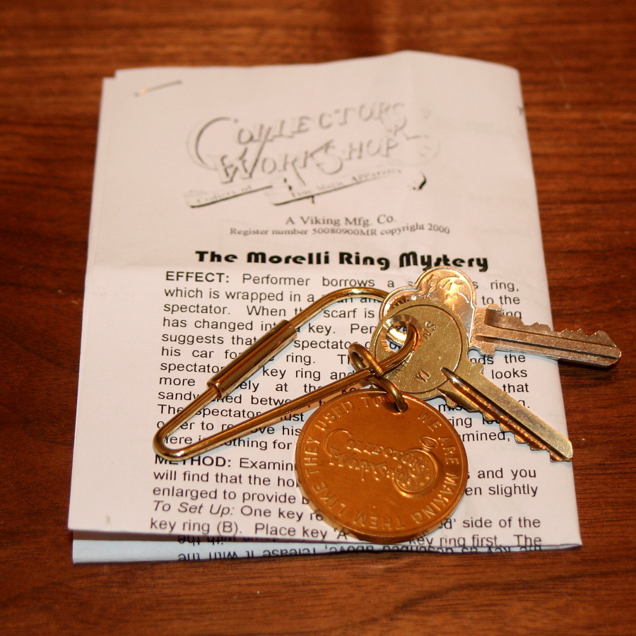 Effect: A spectator’s ring is borrowed and laced onto a shoelace which is wrapped around the performers hand, sealing the ring within the confines of the performer’s clenched fist. His other hand removes a key ring from his inside coat pocket. It is plainly seen to contain only keys. The key ring is placed under a handkerchief.