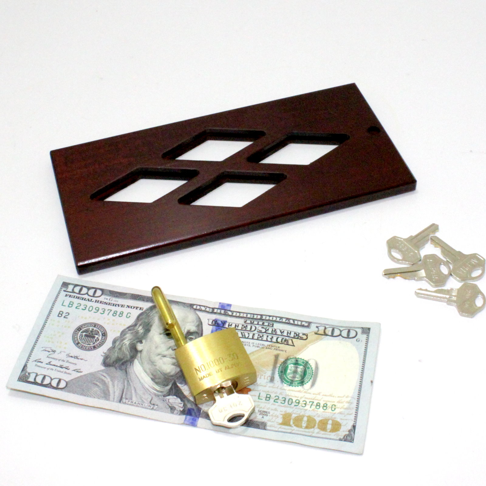 Effect: Make a bet that gives you very bad odds, only 20% chance you’ll win! Place a dollar bill into a wooden wallet, and a spectator locks it in with a padlock. The dollar bill remains visible through 2 holes in the wallet at all times!