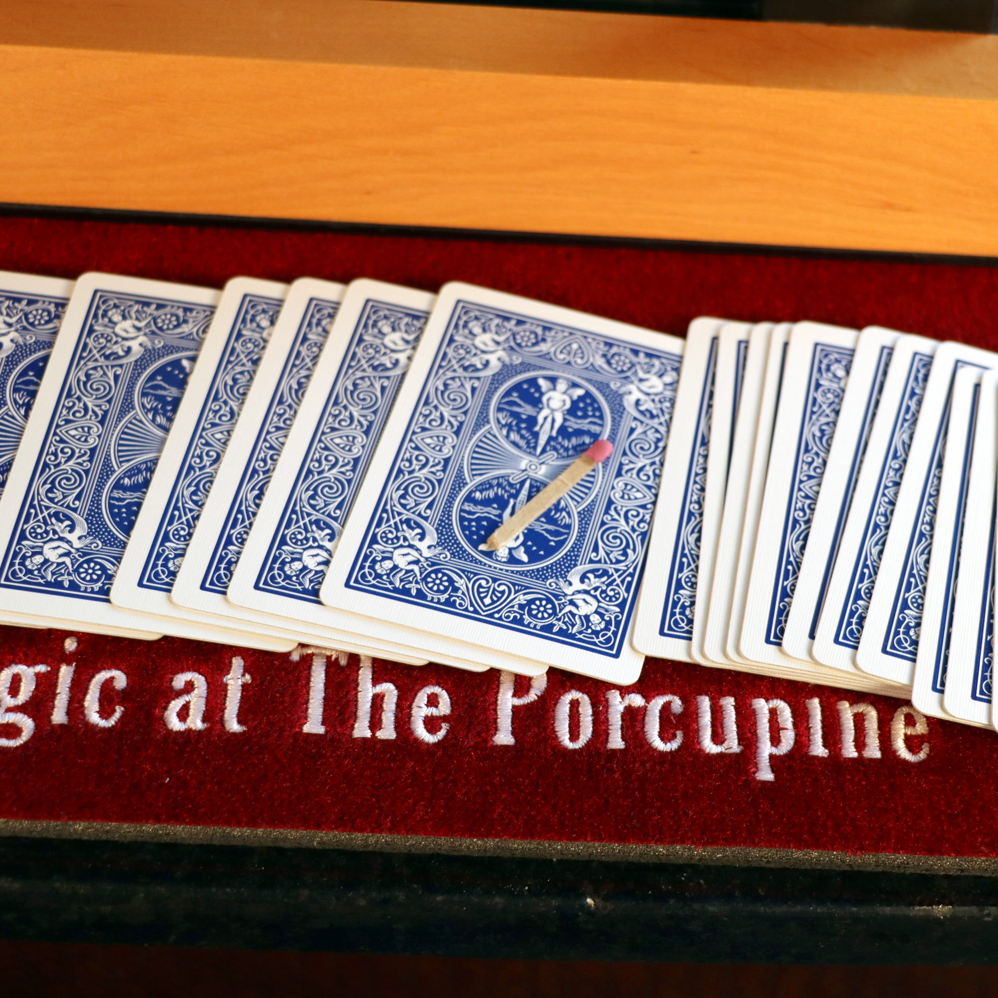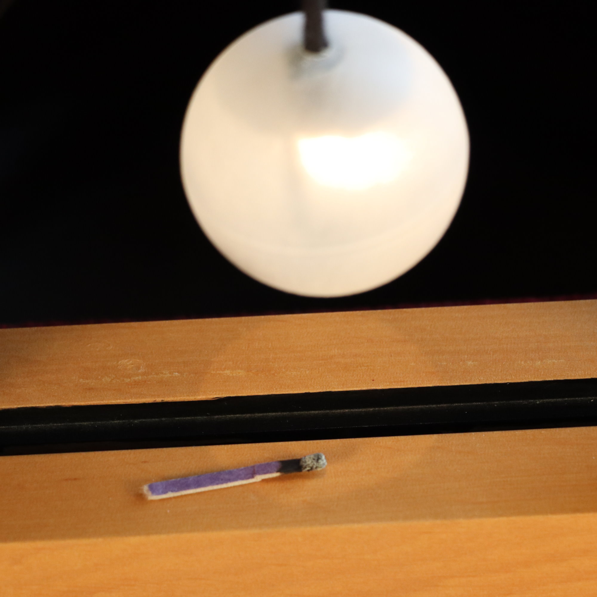 A match is taken from a small matchbook with the design of bicycle playing cards and lit and waved near the ball, and mysteriously the bulb turns on and shines a light down. With the mystical light now shining the deck is spread face down and the spectator places the match on the back of any freely selected card. The card is turned over and shown to the spectator to remember. The card is cleanly lost into the deck.